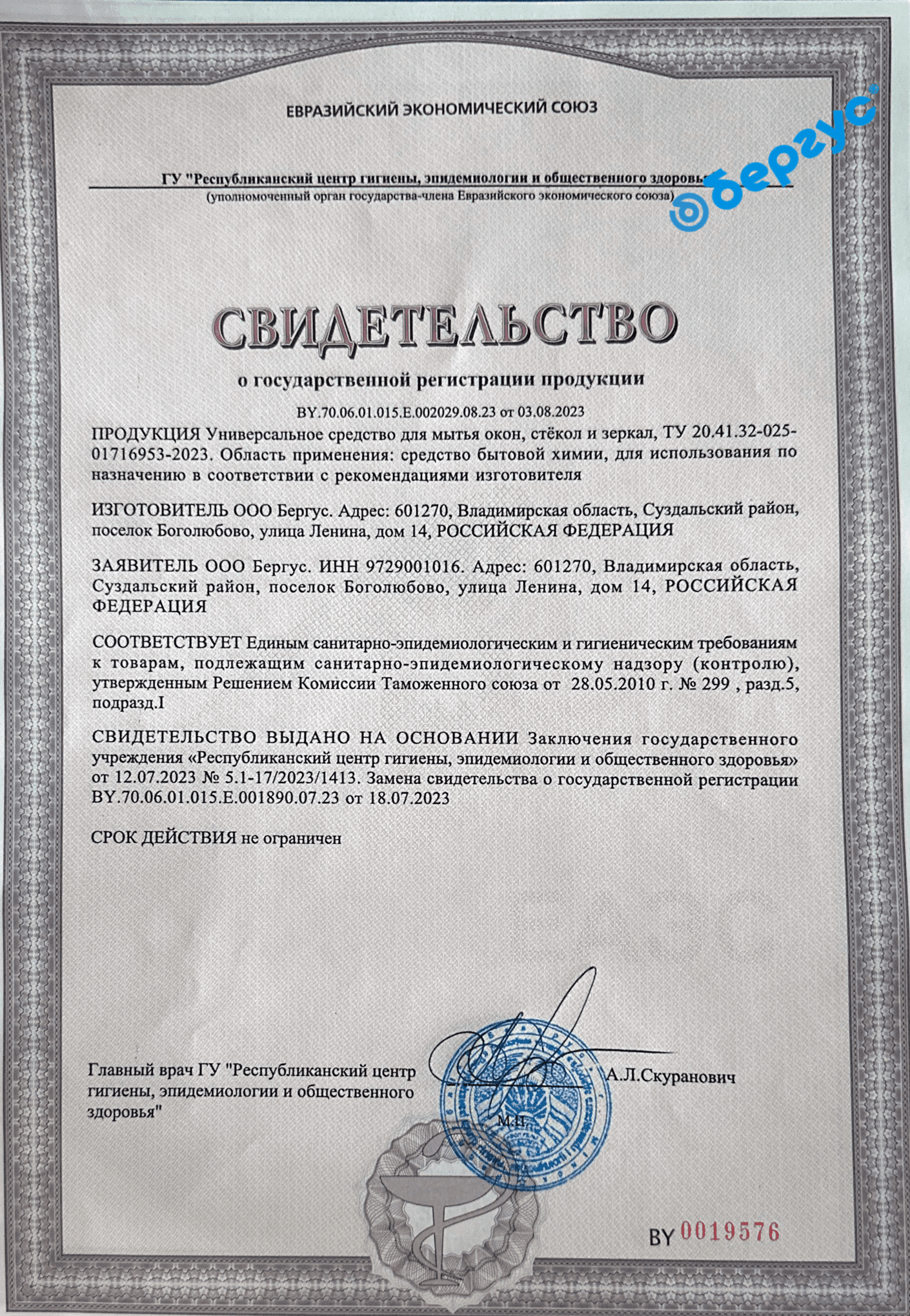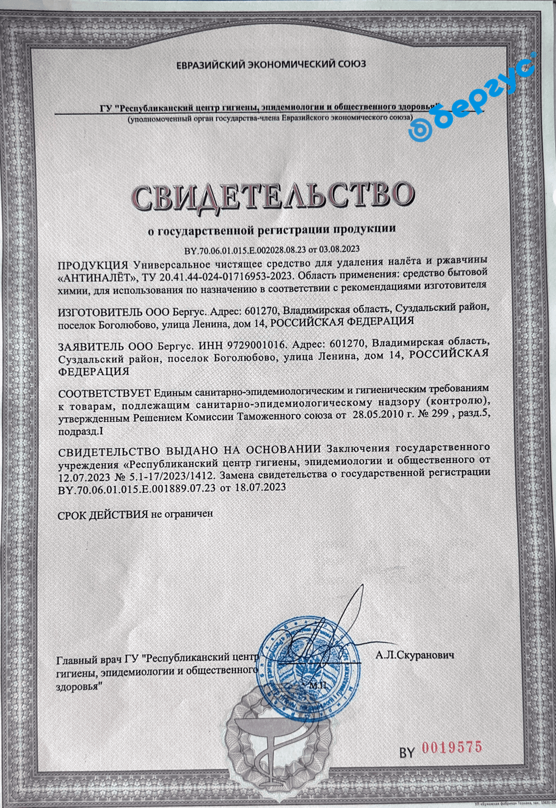 State Registration Certificate for Universal Cleaning Gel for Toilets with Active Chlorine Content