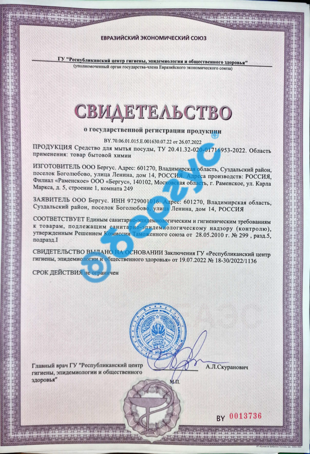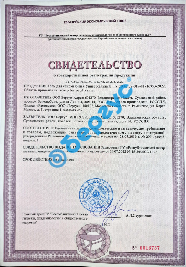 State Registration Certificate for Universal Washing Gel