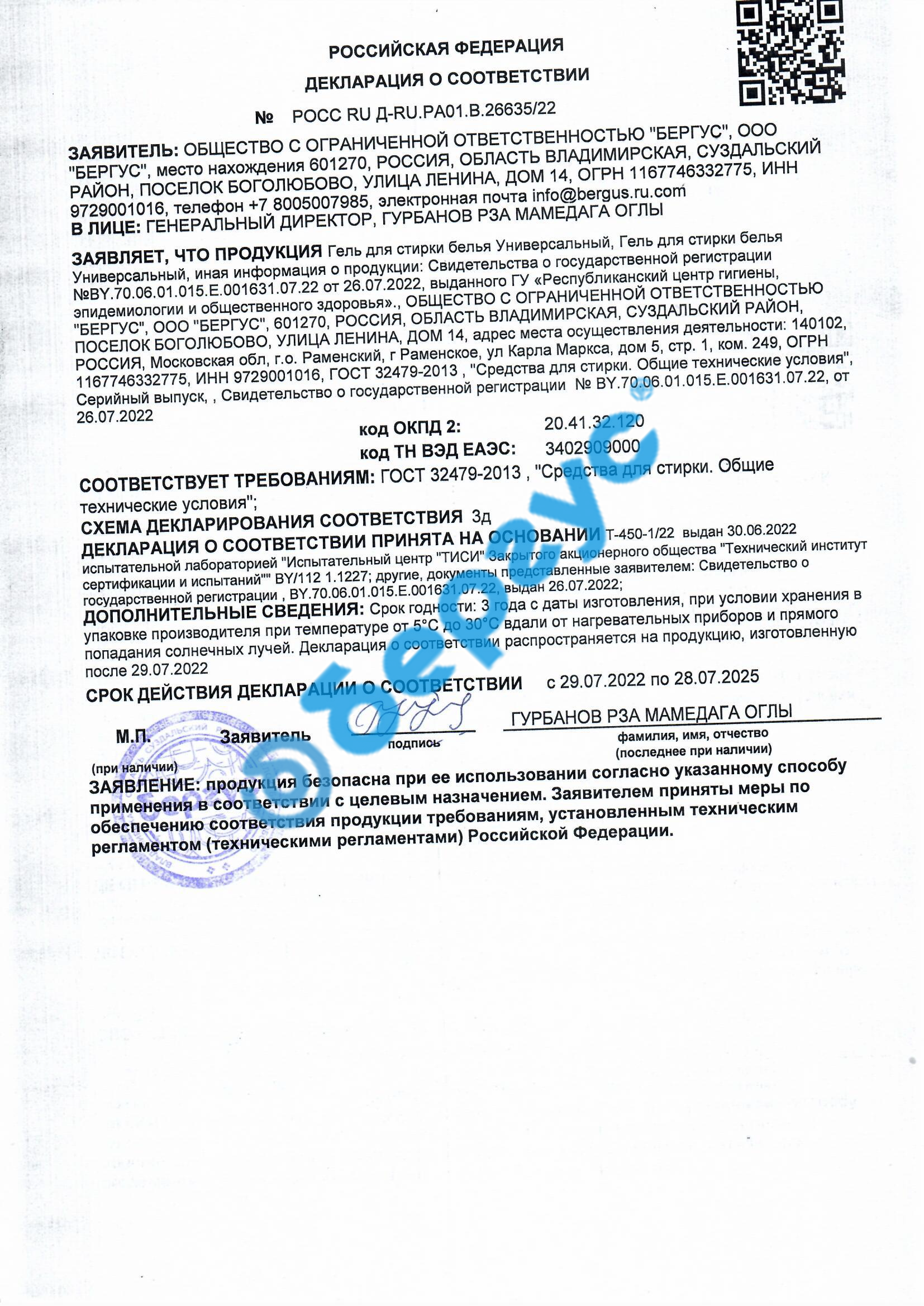 Conformity Declaration for Gel for gentle laundry washing, Gel for washing colored laundry