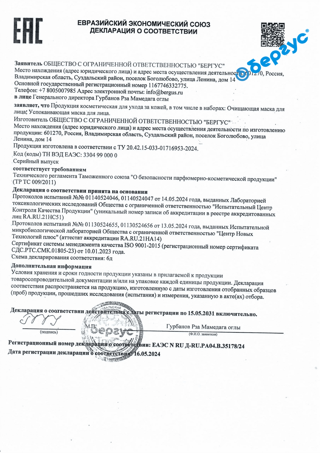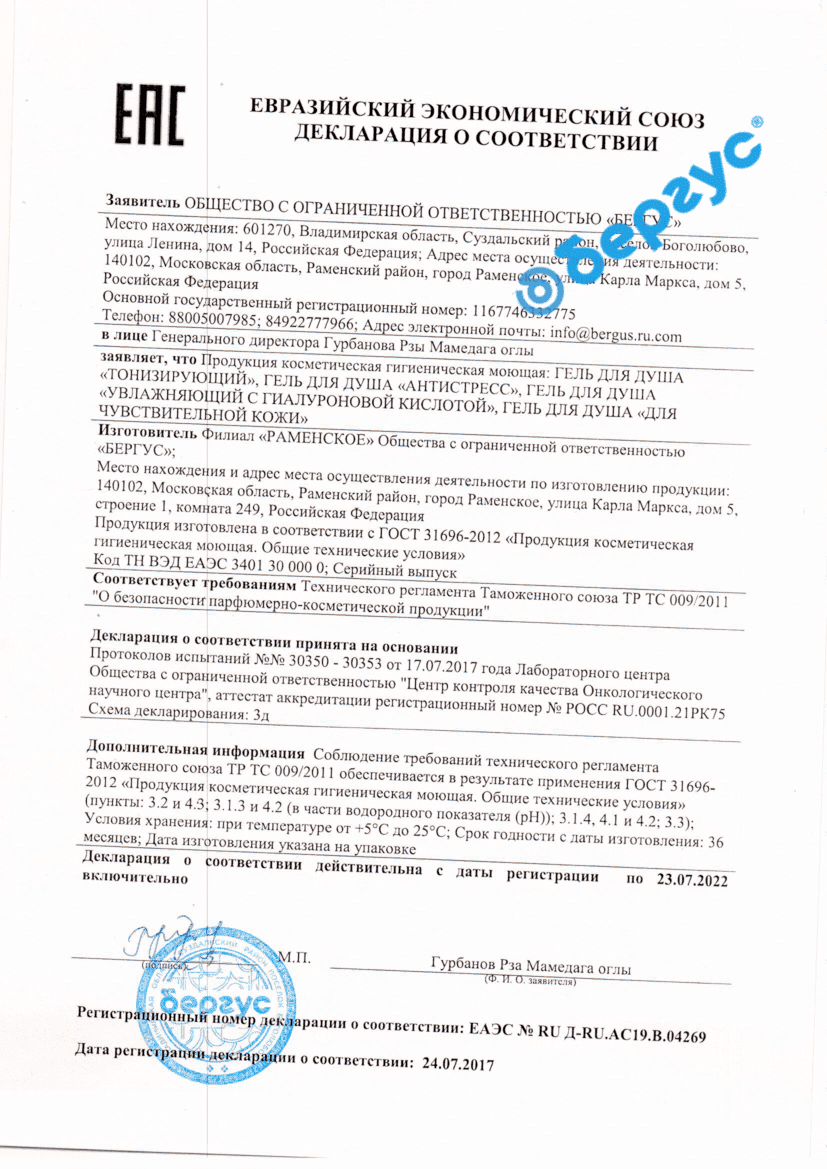 Declaration of conformity TR TS 009 for Soothing mask, Cleansing mask