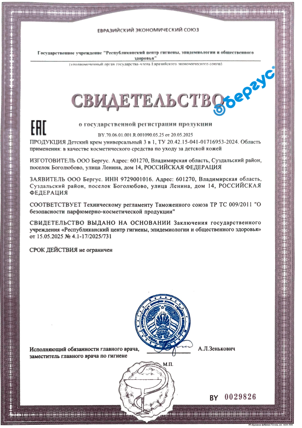 Вся уходовая косметика «Бергуса» успешно прошла необходимые испытания. Это подтверждает документация на косметику, а именно Свидетельства о государственной регистрации, выданные Роспотребнадзором.