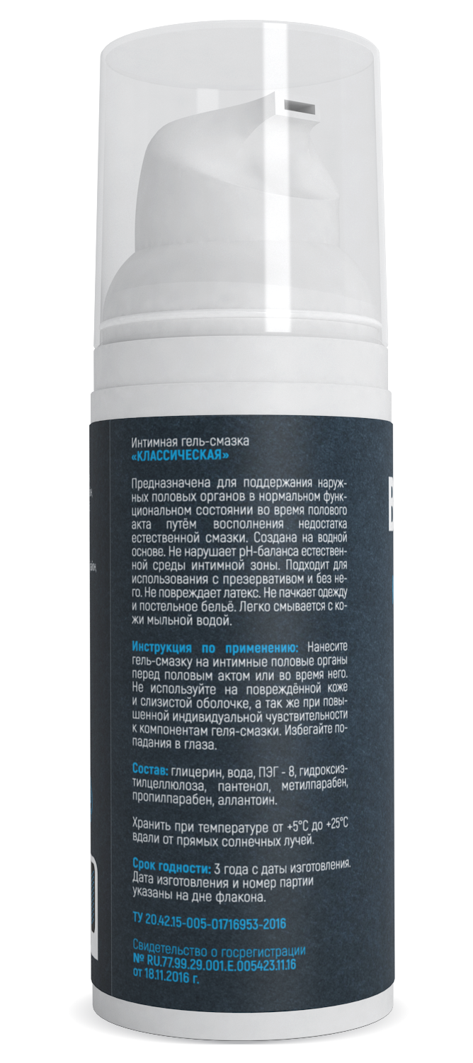 Упаковка двух видов: флакон с вакуумным дозатором. Объём упаковки — 50 мл. Компактная. Имеет контроль первого вскрытия и использования - 3 "холостых" нажатия на дозатор. Блокирует доступ воздуха к лубриканту, сохраняя его качества в течение всего срока годности.