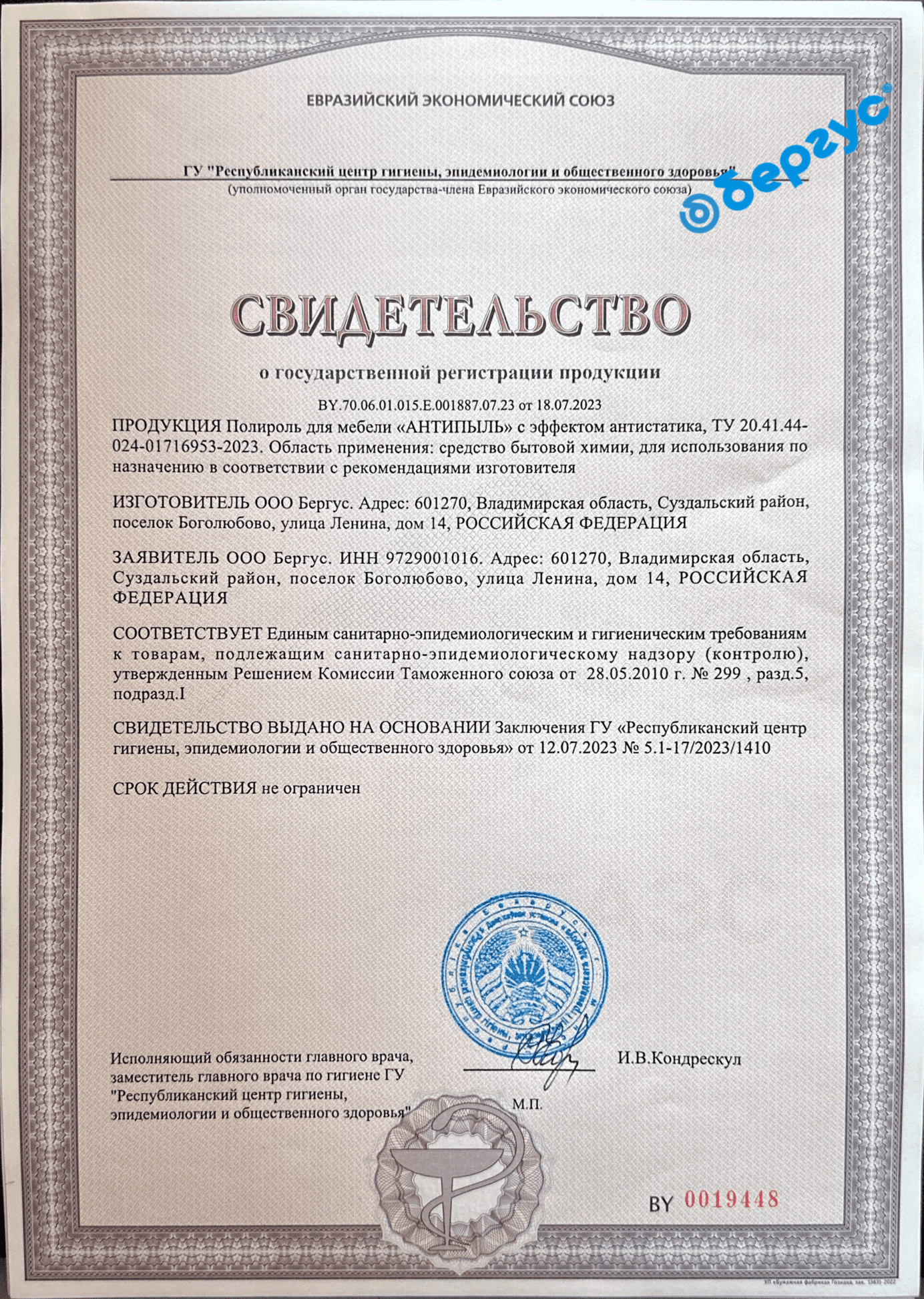 State Registration Certificate for Universal Cleaning Gel for Toilets with Active Chlorine Content