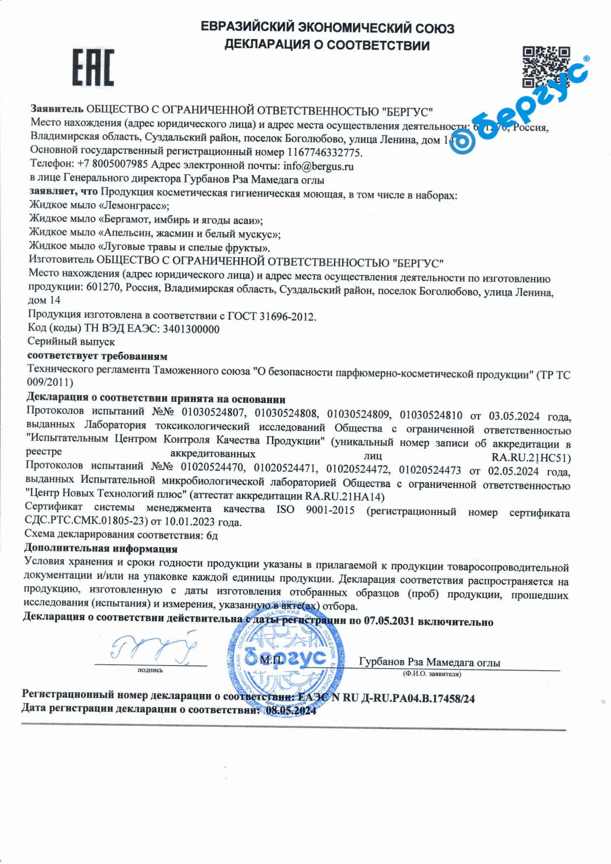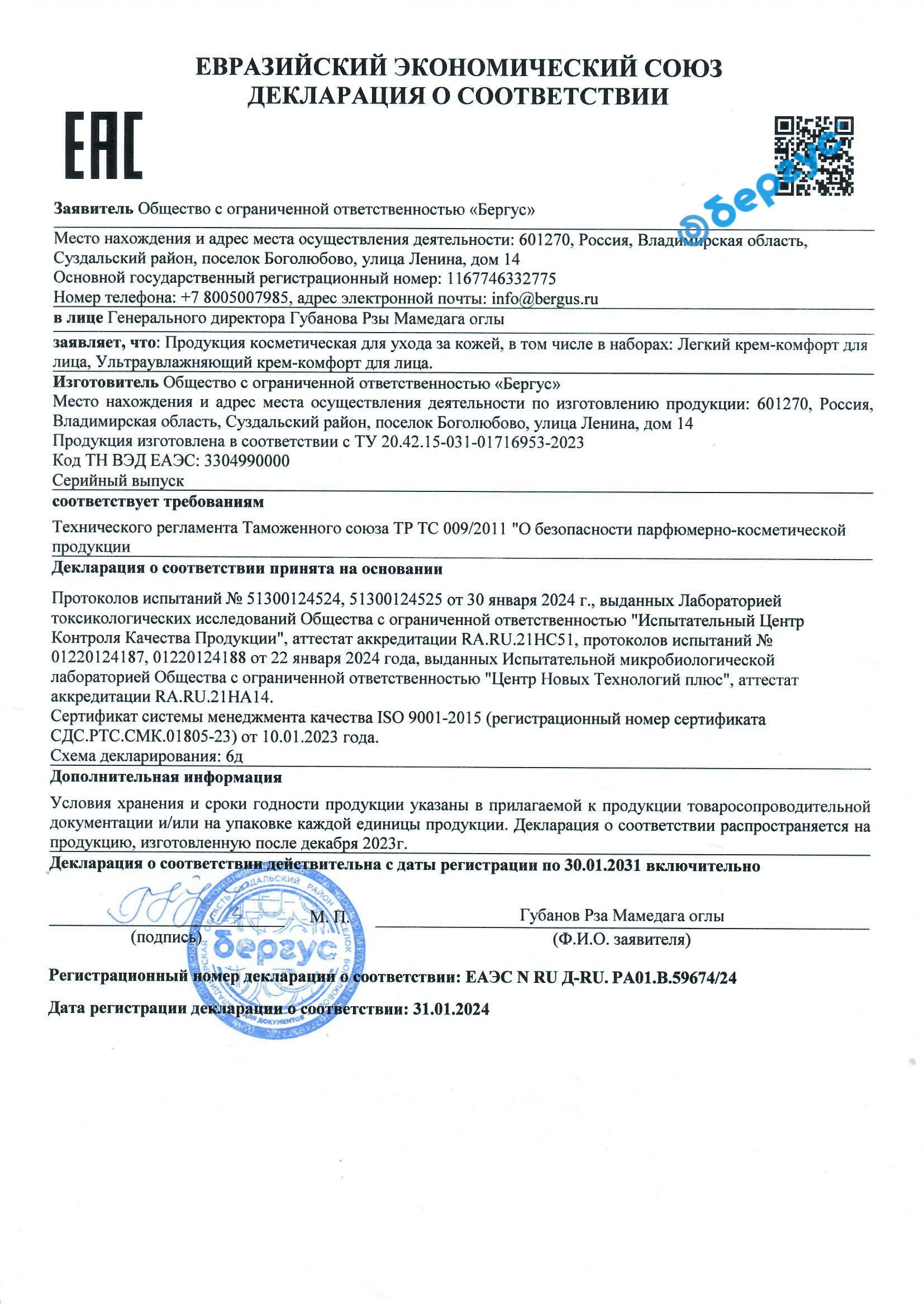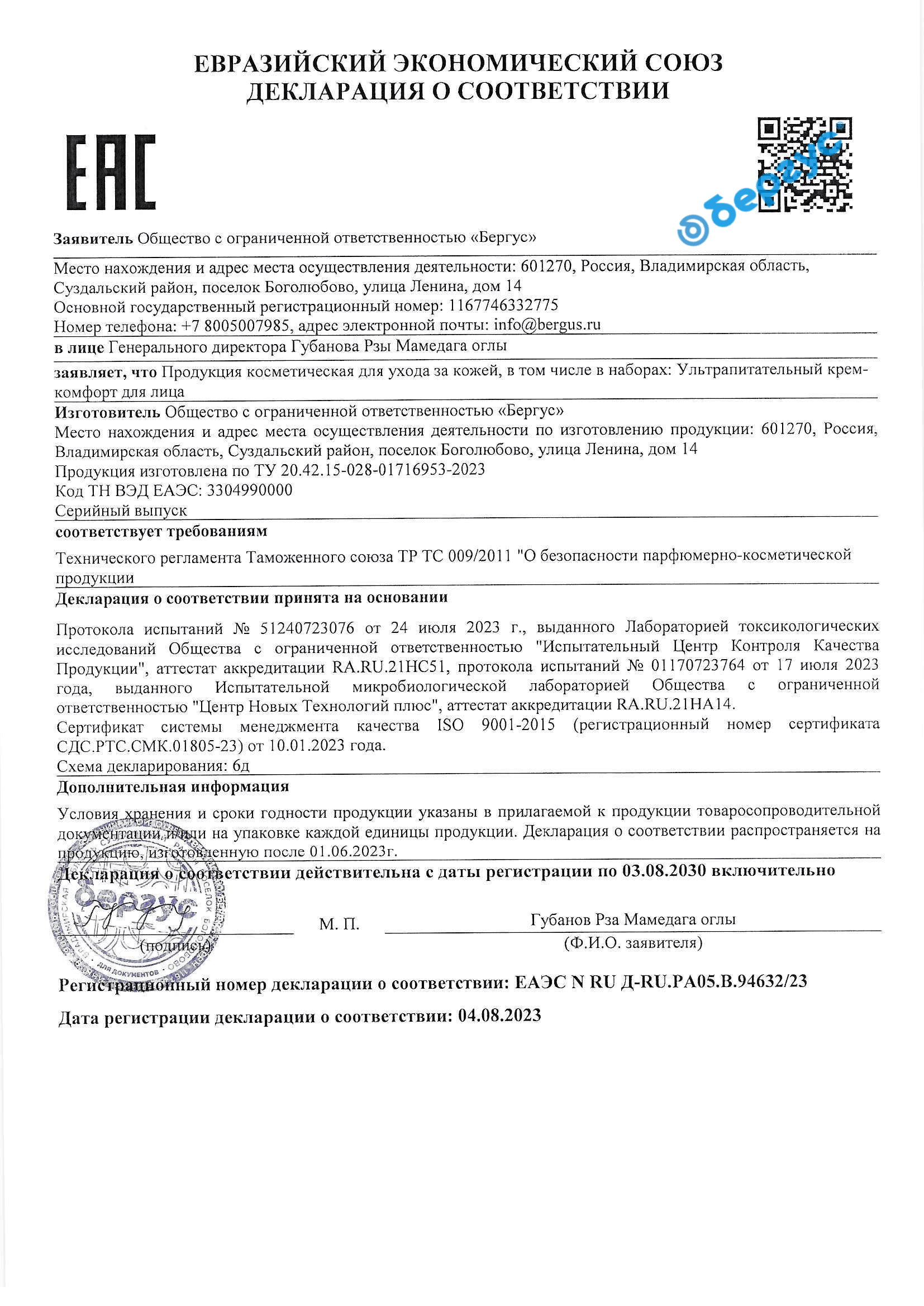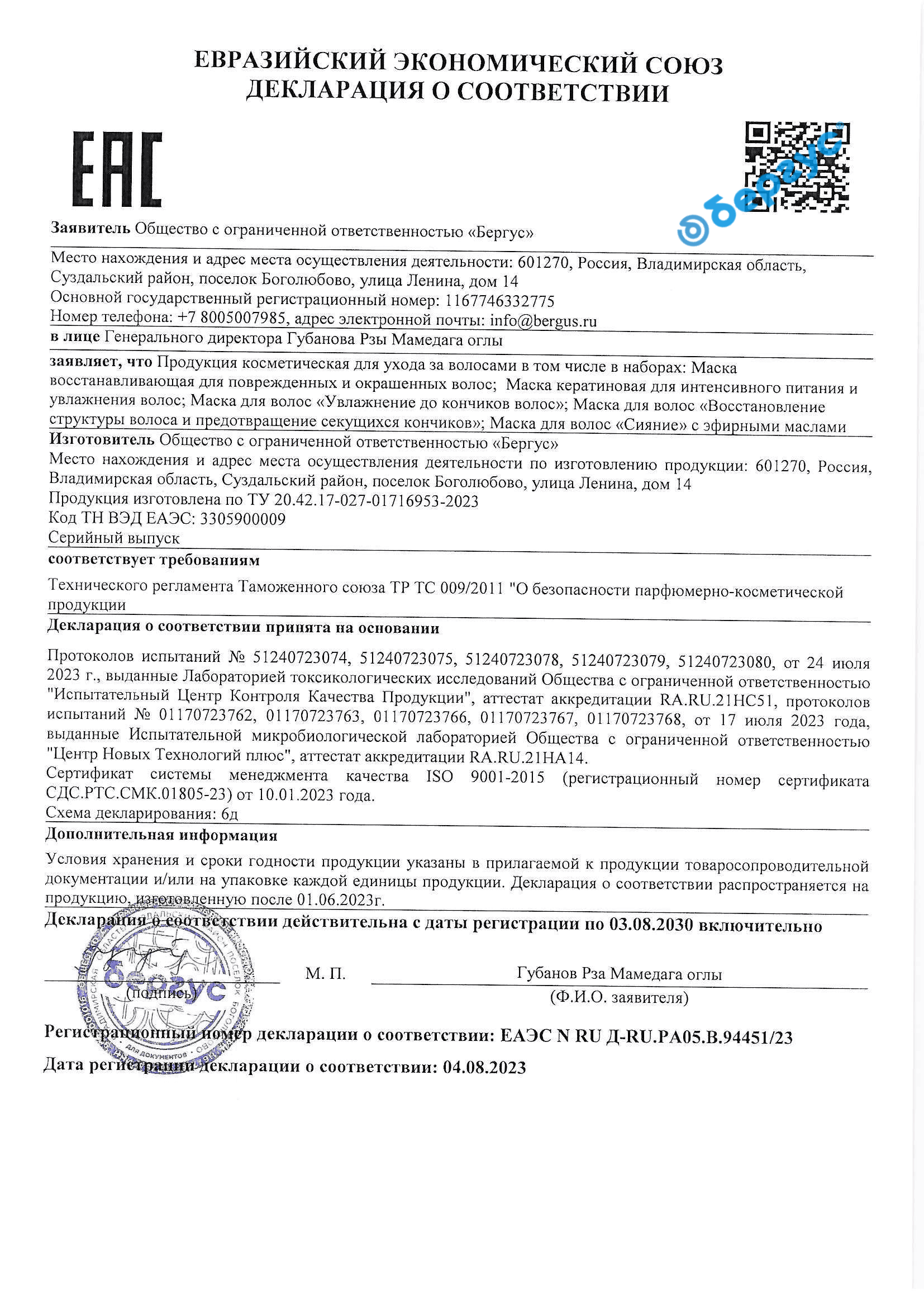 Declaration of conformity TR TS 009 for Soothing mask, Cleansing mask