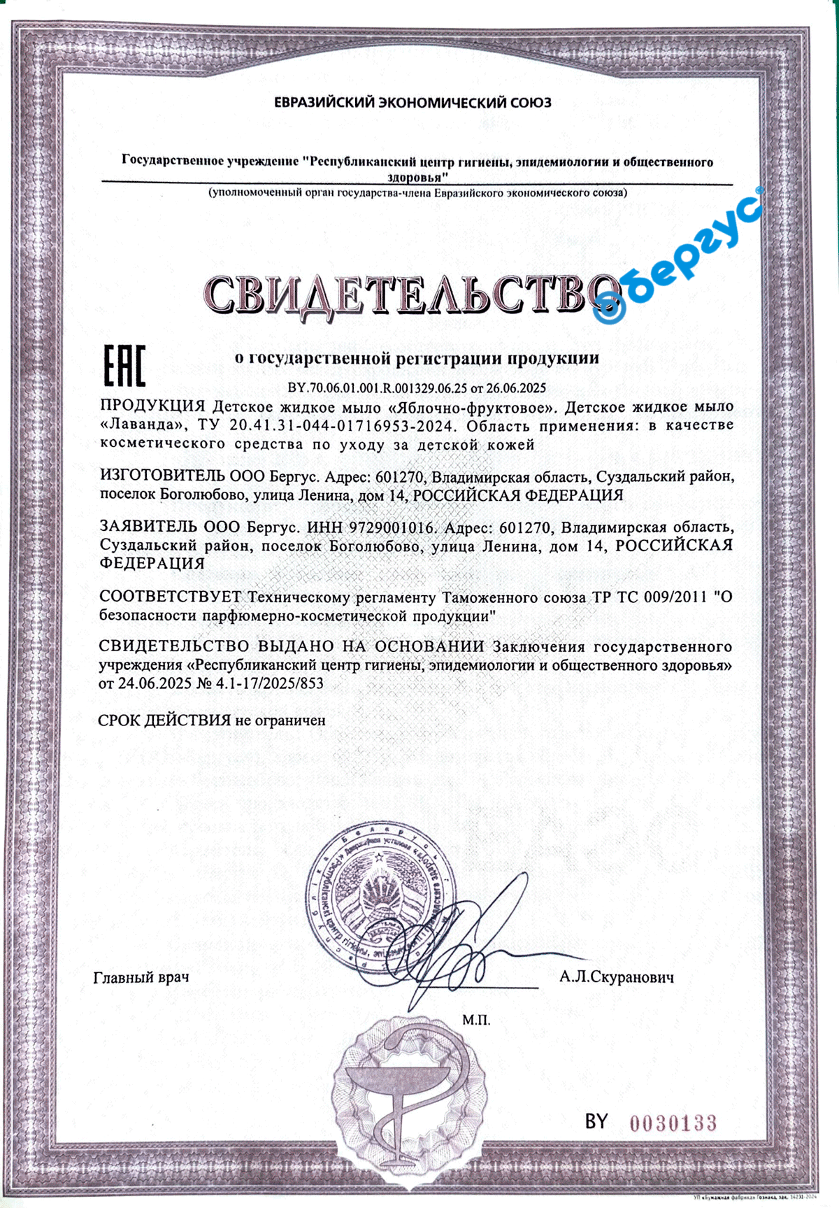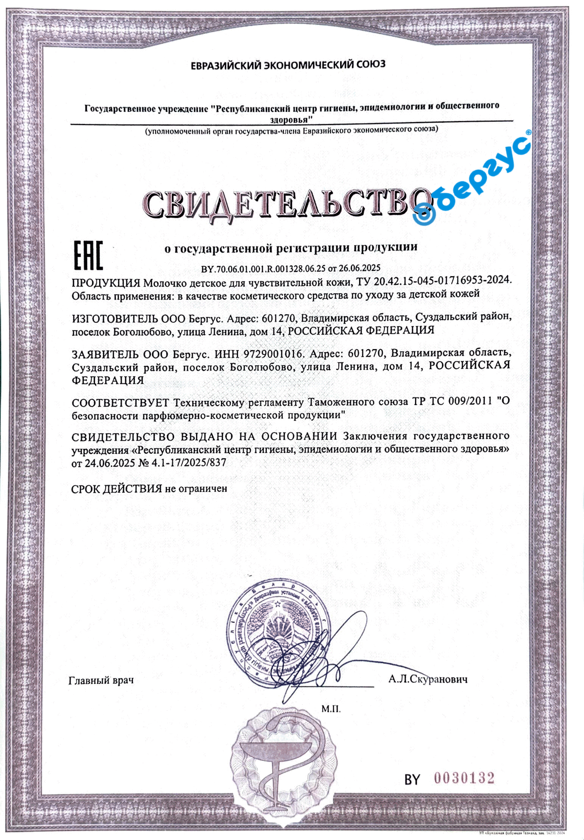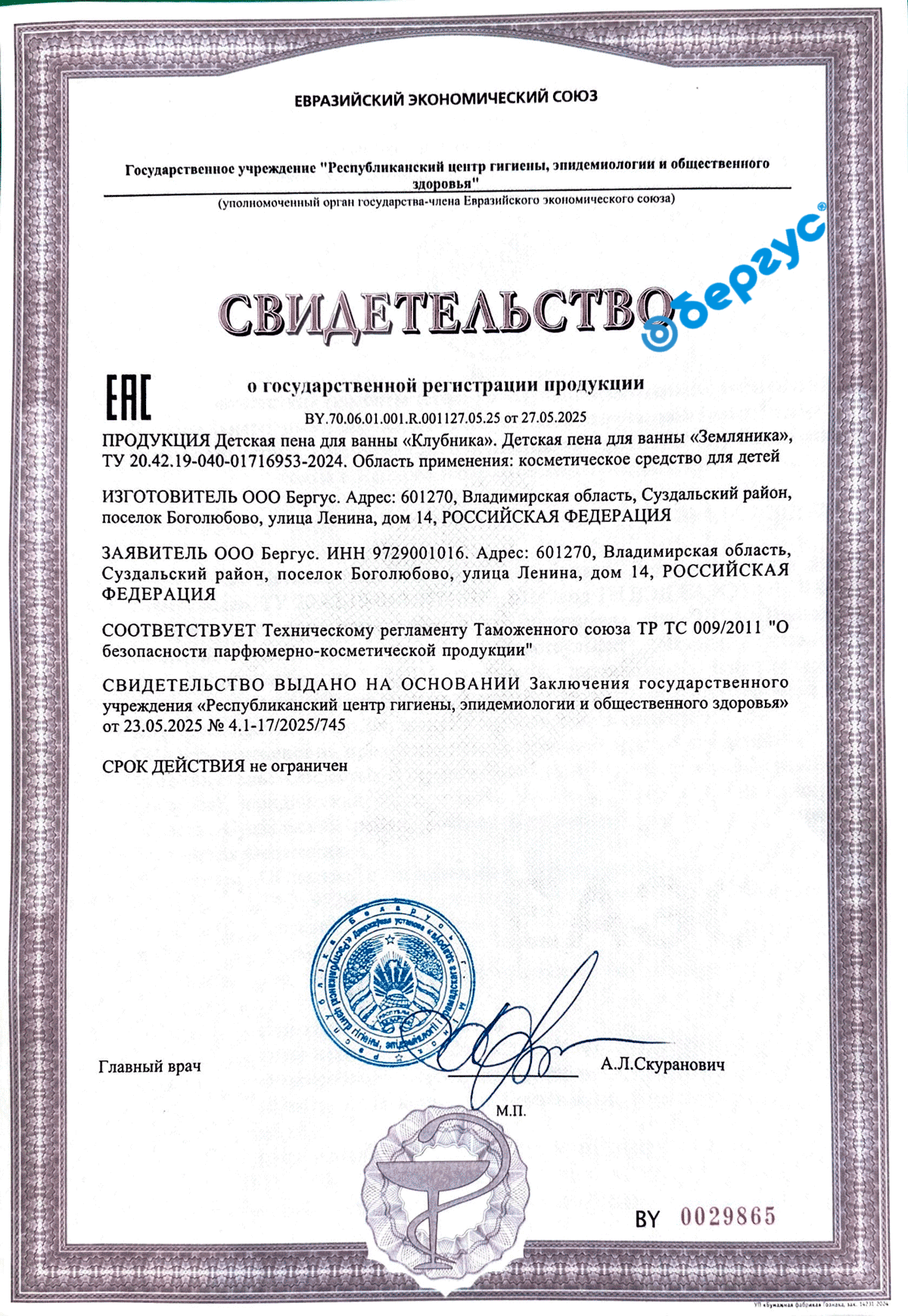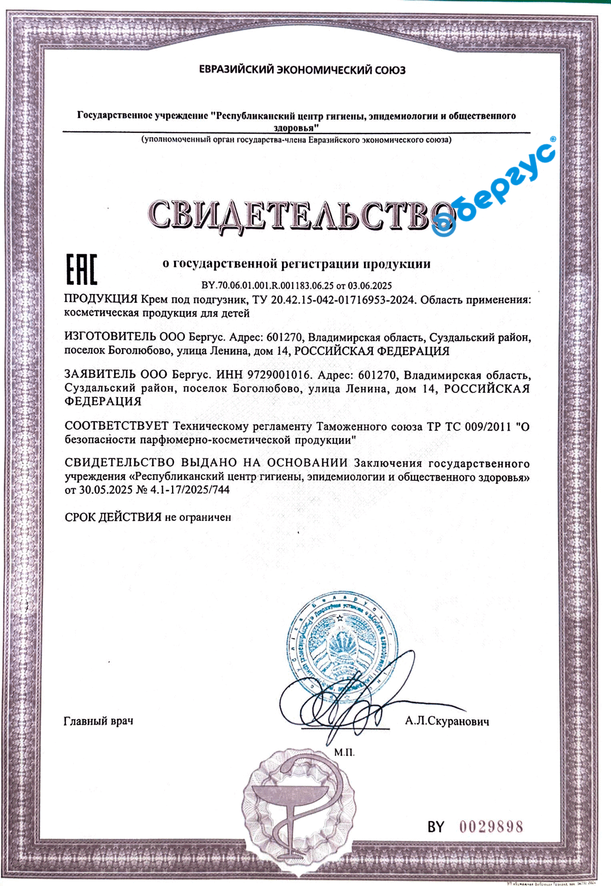 Вся уходовая косметика «Бергуса» успешно прошла необходимые испытания. Это подтверждает документация на косметику, а именно Свидетельства о государственной регистрации, выданные Роспотребнадзором.